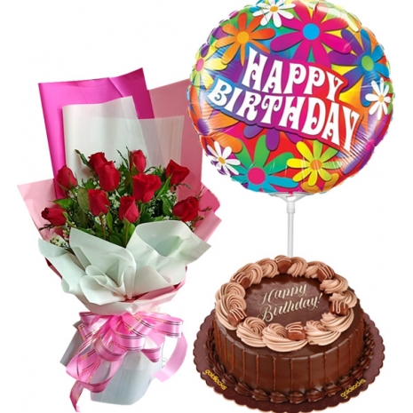 Look no further than this stunning bouquet of 10 red roses! This beautiful arrangement is accented with a Happy Birthday mylar balloon and a delicious Double Dutch Cake by Goldilocks, making it the perfect gift to celebrate any special occasion.