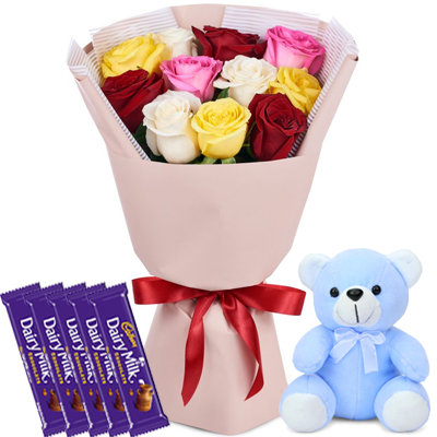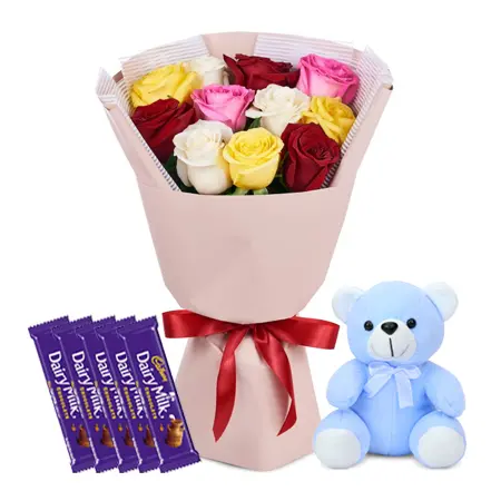 Look no further than this gorgeous bouquet of mixed-color roses! This bouquet comes with a free box of Cadbury Dairy Milk chocolates and a small teddy bear, making it the perfect gift for any occasion.