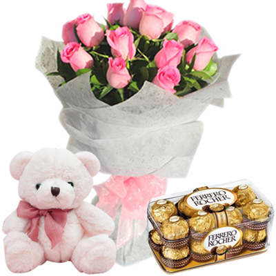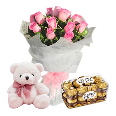 Why not send them a dozen pink roses? This bouquet also comes with a box of 16 Ferrero Rocher chocolates and a small bear, making it the perfect gift for any occasion.