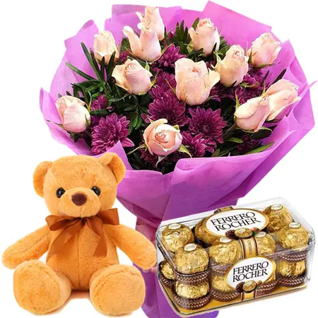 Look no further than our One Dozen Pink Roses in a bouquet! This beautiful bouquet is accompanied by 16pcs Ferrero rocher chocolates and a small teddy bear, making it the perfect gift for any occasion.