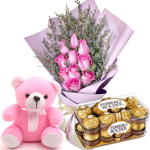 In addition to the gorgeous roses, the bouquet also comes with a box of 16 Ferrero Rocher chocolates and a small teddy bear. The chocolates are perfect for sharing, and the teddy bear is sure to become a cherished keepsake.