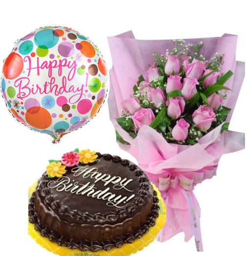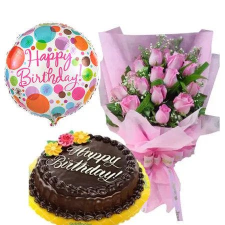 12 Beautiful Pink Roses with Chocolate Chiffon Cake By Goldilocks and 1pcs Happy Birthday Mylar Balloon. ( Balloon design mat vary)