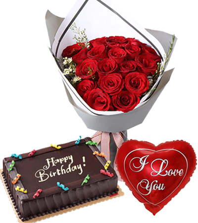 This gift hamper is perfect one to make your beloved happy and sure to make him/her smile. It includes 12 fresh red roses beautifully combined with a I love you mylar balloon and chocolate cake by red ribbon.