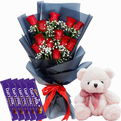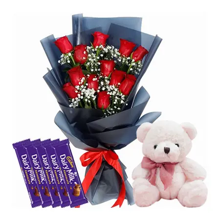 - One Dozen Red Roses in Bouquet: The red roses are a symbol of love and passion, and the teddy bear and Cadbury Dairy Milk bars are a sweet and thoughtful touch.