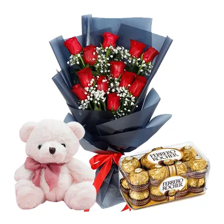 One dozen red roses in bouquet, 16 pcs Ferrero rocher chocolate box with small size teddy bear. Send flowers and gifts to the Philippines with the best online flower shop in the Philippines.