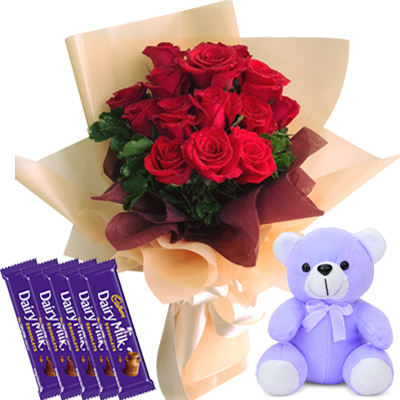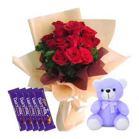 In addition to the beautiful flowers, this bouquet also comes with a box of Cadbury Dairy Milk chocolate bars. There are five bars in the box, every 30 grams. The chocolate is creamy and delicious, and it's sure to satisfy any sweet tooth. Plus, the box comes with a small teddy bear, which is sure to put a smile on the recipient's face.