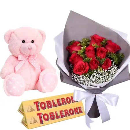 Looking for the perfect gift? Look no further than this amazing bundle! Featuring a dozen red roses in a beautiful bouquet, along with a delicious 2pcs 100g. Toblerone chocolate bar and a cute teddy bear, this gift is sure to please.