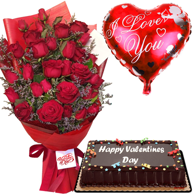 Two dozen red roses in a beautiful bouquet, I love you mylar balloon with Ultimate Chocolate Cake by Red Ribbon Chocolate dedication cake.