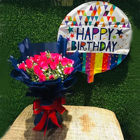The 24pcs pink rose bouquet with 1pcs mylar Balloon is a beautiful way to show your loved one how much you care. This bouquet includes 24 pink roses and 1 mylar balloon. The balloon is a great way to show your loved one how much you care.