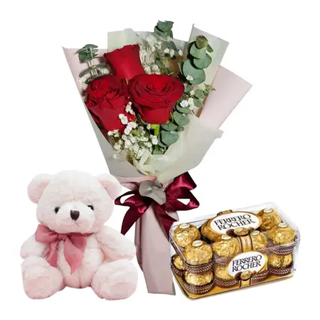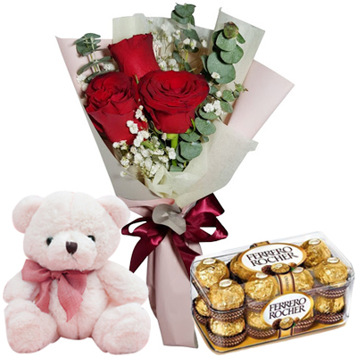 1. Simply choose the 3 pcs red roses in bouquet,16 pcs. Ferrero rocher chocolate box with a small brown bear that you would like to send.