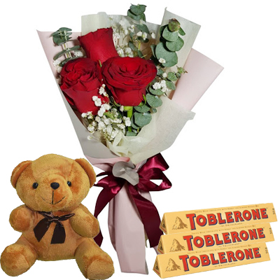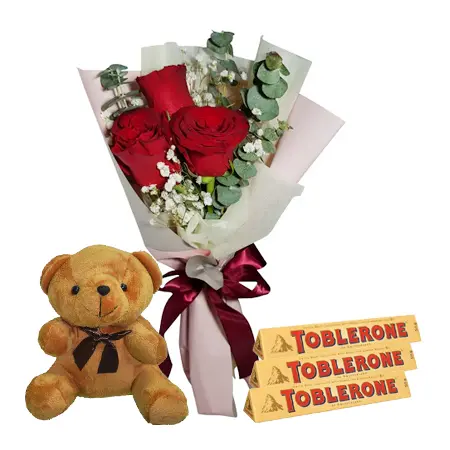 3 Red Roses Bouquet,Toblerone Chocolate with Bear