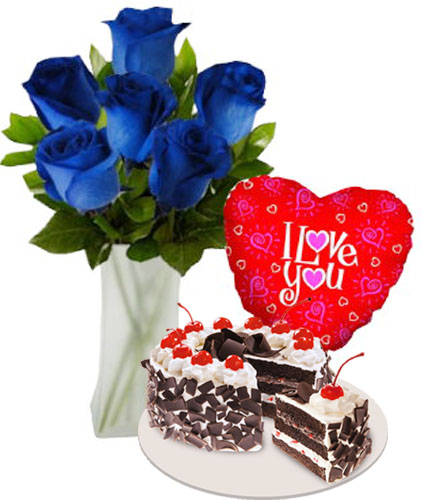 A beautiful present for your loved ones consisting of round black forest cake by red ribbon with heart shaped balloons and 6pcs Blue Roses in vase showing your love and affection for your cared and loved ones.