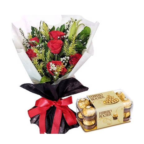 6 Red Roses bouquet with 16 pcs Ferrero Roche Chocolate. Stunning, unique, and utterly opulent, this breathtaking bouquet of classic roses and lush greenery is sheer visual poetry. These blissful, velvety blooms are the perfect token of your affection and love this Day!
