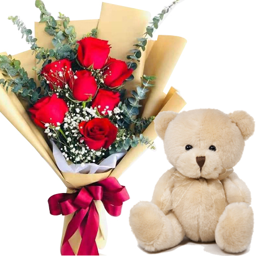 7.pcs Red Roses in a Bouquet with 1 Feet Teddy Bear