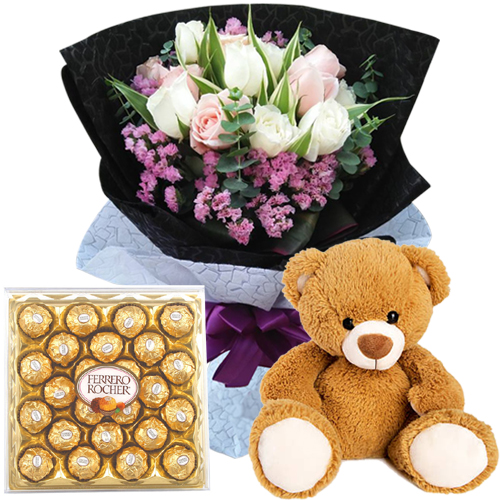 Is it a special day? Make it even more special with a bouquet of 8 white and pink flowers, 24 pieces of delicious Ferrero Rocher chocolates, and a small size teddy bear. With just one click, have it delivered to your loved ones in the Philippines.