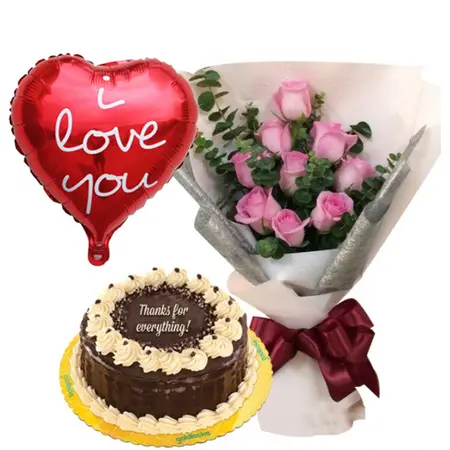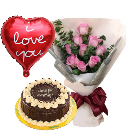 9 Pink color Roses in a Bouquet with Rocky Road Cake & I Love You Heart Shaped Mylar Balloon. (Balloon design may vary)