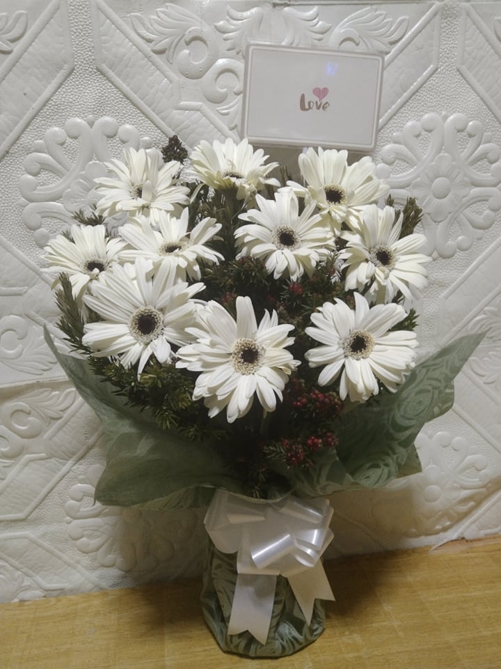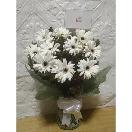 Look no further than this gorgeous bouquet of 10 white gerberas! this arrangement is an exquisite way to show your loved ones how much you care.