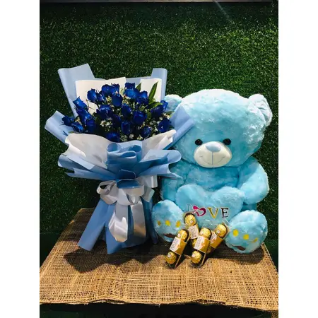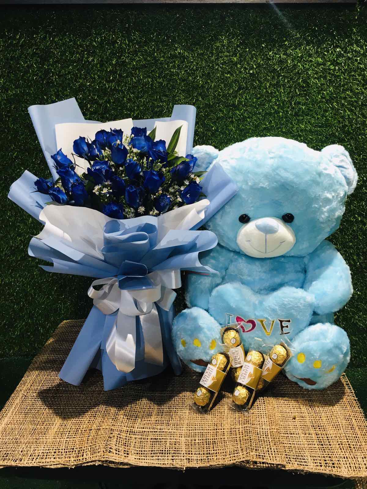 Description: This combo includes a 24pcs blue rose bouquet with a 2ft blue teddy bear and 3 packets of a 3pcs Ferrero rocher.