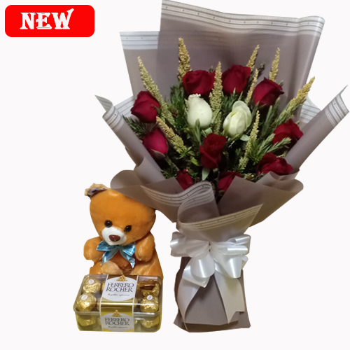 10 Red roses and 2 white roses in a bouquet, Ferrero rocher 16pcs chocolate, and a cute teddy bear