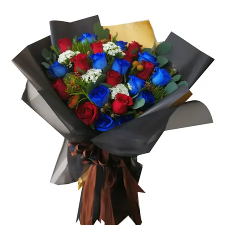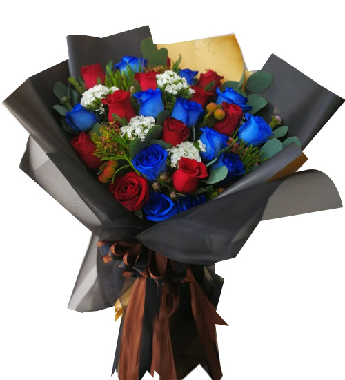 24Pcs. Red & Blue Color Fresh Roses in a Gorgeous Hand Bouquet Arrangement.