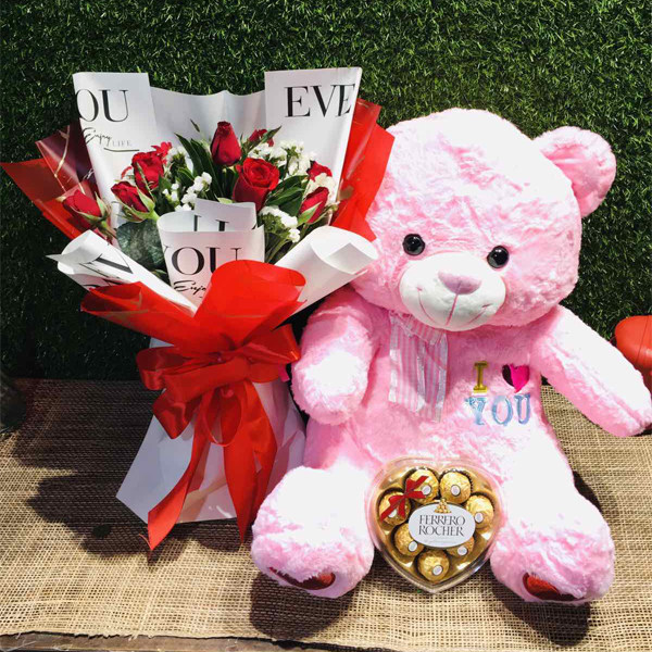 Description: Our 12pcs Red Rose with 2ft Pink Teddy, Chocolate, and Heart Shape Ferrero Rocher Box bundle is the perfect way to show someone you care. This stunning gift set includes fresh and vibrant red roses, a soft and cuddly 2ft pink teddy bear, and a heart-shaped box of delicious Ferrero Rocher chocolates. Order now and bring a smile to their face with this beautiful and thoughtful gift.