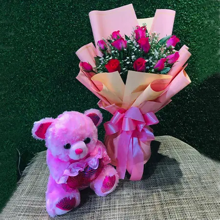 These 12pcs pink roses with a pink color small size teddy bear are the perfect way to do it! The roses are beautiful and the teddy bears are so cute.