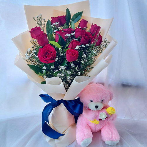 Then send them this 12pcs red rose bouquet with a small size teddy bear! They'll love the beautiful roses, and the adorable teddy bear is sure to put a smile on their face. Plus, it's a great way to show your love on any occasion.