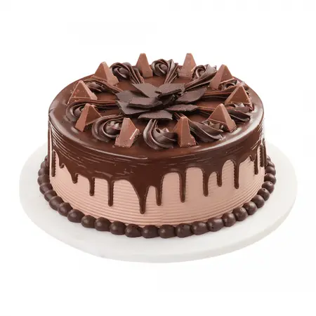 Deliciously moist chocolate caramel cake with buttercream and choco mousse filling, topped with chocolate ganache, Toblerone chunks, and chocolate shavings.