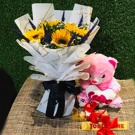 Look no further than this amazing bundle! It includes 5 sunflowers, 1 Toblerone 100g chocolate, and 5pcs chocolate Ferrero Rocher packet, 12inch teddy bear. This is the perfect gift for anyone who loves chocolate and flowers.